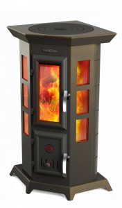 Дополнительно к остеклению дверцы у этой печи имеется большой остекленный эркер, набранный из шести отдельных стекол. При этом, за счет углового расположения печи, огонь в окошках хорошо видно в любой точке помещения.